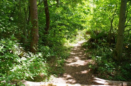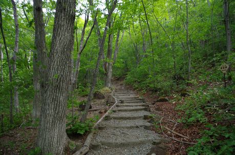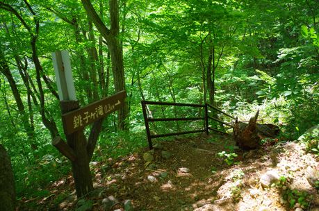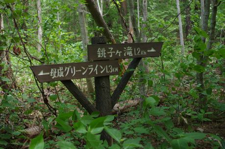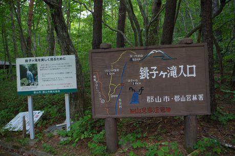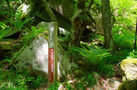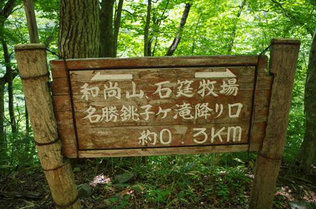 この看板のところまではわりと平たんな道のりなのですが、この先滝までは、急な階段をおりていくことになります。
