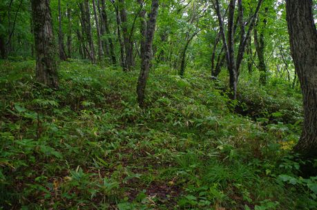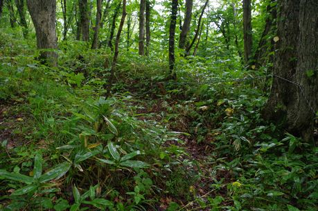 雑草が多くて非常に見にくいですが、ロープの手前が塹壕です。